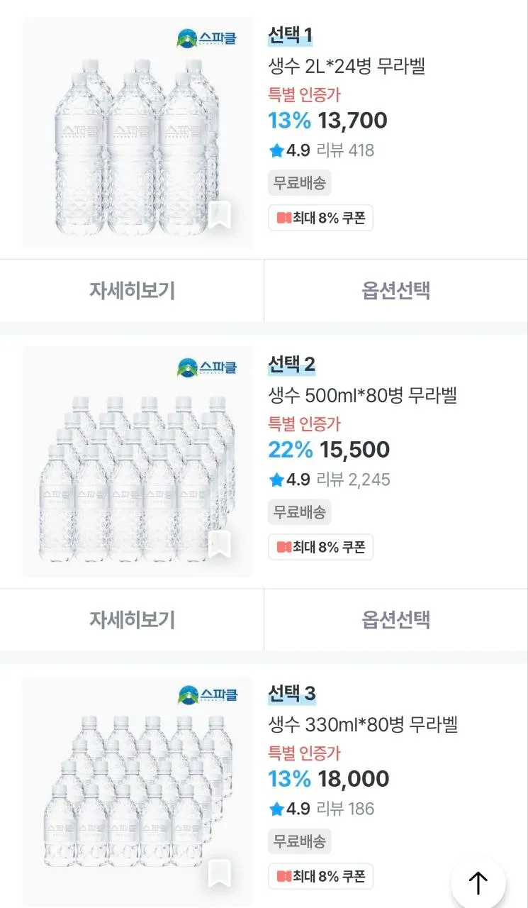링크 https://ozip.me/6eA7oxj 쇼핑몰 오늘의집 상품명 스파클 생수 무라벨 2L*24병 외 가격 11,704원 배송비 무료 선택 자세히보기 > 쿠폰받으면 됨 선택1 … 더보기